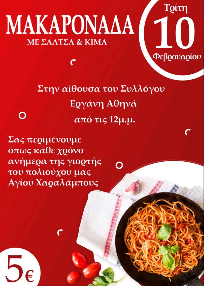 Στο πλαίσιο της γιορτής, από τις 12 το μεσημέρι, ο Γυναικείος Σύλλογος «Εργάνη Αθηνά» προσκαλεί κατοίκους και επισκέπτες στην αίθουσά του, στο πλακόστρωτο του λιμανιού, για την καθιερωμένη μακαρονάδα. Η διάθεση γίνεται με συμβολική συνεισφορά 5 ευρώ ανά μερίδα, με σκοπό την ενίσχυση του έργου του συλλόγου.