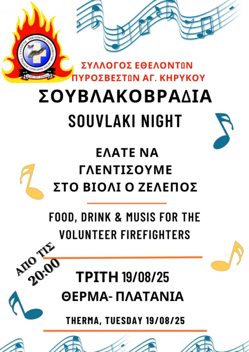 Ο Σύλλογος Εθελοντών Πυροσβεστών Αγίου Κηρύκου την Τρίτη 19 Αυγούστου διοργανώνει σουβλακοβραδιά στη ρεματιά των Θερμών, στα Πλατάνια, από τις 8.00 μ.μ., με την ορχήστρα του Βαγγέλη Ζελεπού.