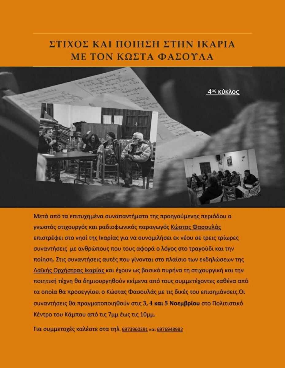 Ο Κώστας Φασουλάς επιστρέφει στην Ικαρία για τον 4ο κύκλο των συναντήσεων «Στίχος και Ποίηση». Ο γνωστός στιχουργός και ραδιοφωνικός παραγωγός θα βρίσκεται ξανά στο νησί για τρεις τρίωρες συναντήσεις, στις 3, 4 και 5 Νοεμβρίου, από τις 7 έως τις 10 το βράδυ, στο Πολιτιστικό Κέντρο Κάμπου, με τη διοργάνωση της Λαϊκής Ορχήστρας Ικαρίας. Οι συμμετέχοντες θα δουλέψουν πάνω στα δικά τους κείμενα, τα οποία ο Κώστας Φασουλάς θα προσεγγίσει με προσωπικές επισημάνσεις και καθοδήγηση.