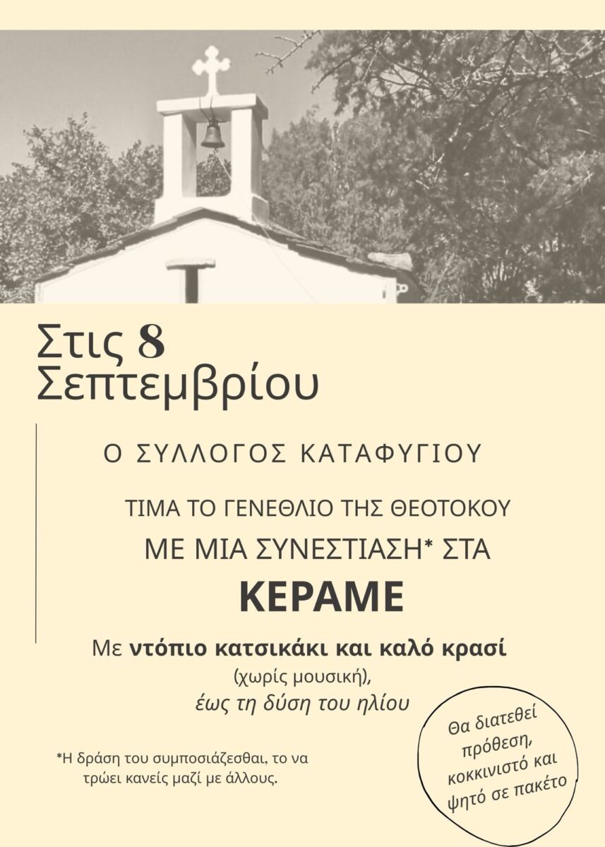 Στις 8 Σεπτεμβρίου, ο Σύλλογος Καταφυγίου τιμά το Γενέθλιο της Θεοτόκου με μια συνεστίαση στα Κεραμέ. Ντόπιο κατσικάκι, καλό κρασί και συντροφιά, μέχρι τη δύση του ήλιου. Χωρίς μουσική, μόνο με τους ήχους της φύσης.