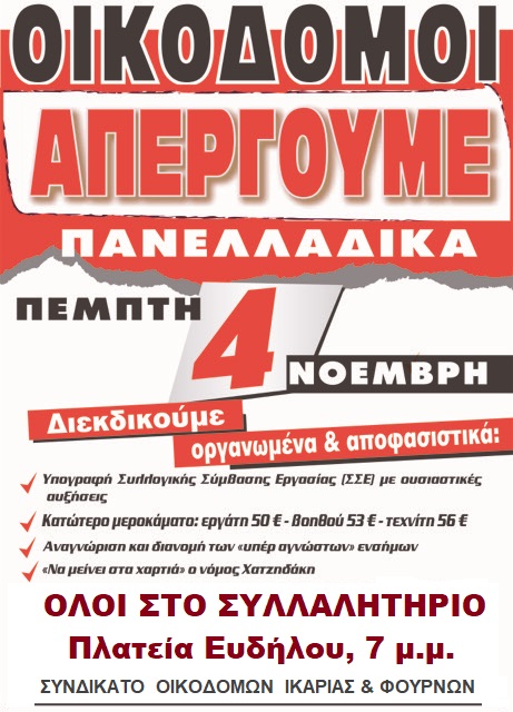 Τα αιτήματα των οικοδόμων που Απεργούν Πανελλαδικά την Πέμπτη 4 Νοεμβρίου