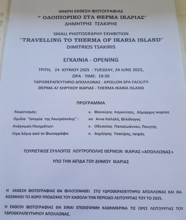 Σήμερα, Τρίτη 24 Ιουνίου, στις 7:30 το απόγευμα, πραγματοποιούνται τα εγκαίνια της φωτογραφικής έκθεσης «Οδοιπορικό στα Θέρμα Ικαρίας» του γιατρού Δημήτρη Τσακίρη. Η εκδήλωση φιλοξενείται στο Υδροθεραπευτήριο Απόλλωνας, με χαιρετισμούς, ομιλία για την ιστορία της λουτρόπολης και ανάγνωση ποιημάτων. Η έκθεση θα παραμείνει επισκέψιμη καθημερινά καθ’ όλη τη διάρκεια λειτουργίας του υδροθεραπευτηρίου για το 2025.