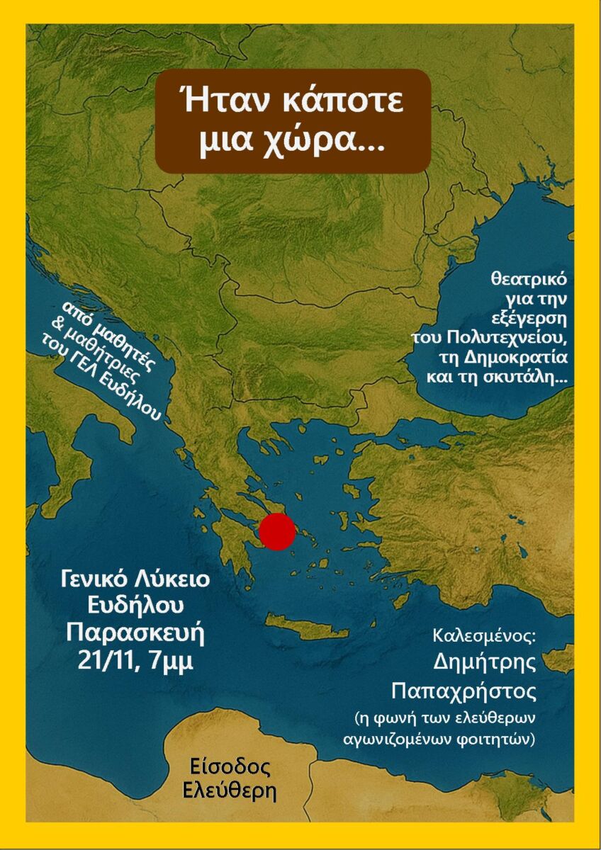Την Παρασκευή 21 Νοεμβρίου, στις 19:00, στο Γενικό Λύκειο Ευδήλου «Αριστείδης Φουτρίδης» θα παρουσιαστεί η θεατρική παράσταση «Ήταν κάποτε μια χώρα…», έργο του Βασίλη Λουκά, διευθυντή του σχολείου, που γράφτηκε το 2013 και αναφέρεται στην εξέγερση του Πολυτεχνείου, τη Δημοκρατία και τη σημασία της ιστορικής μνήμης. Την παράσταση ανεβάζει η θεατρική ομάδα του ΓΕΛ Ευδήλου, σε σκηνοθετική επιμέλεια του Βασίλη Λουκά και της Φωτεινής Χρονοπούλου.