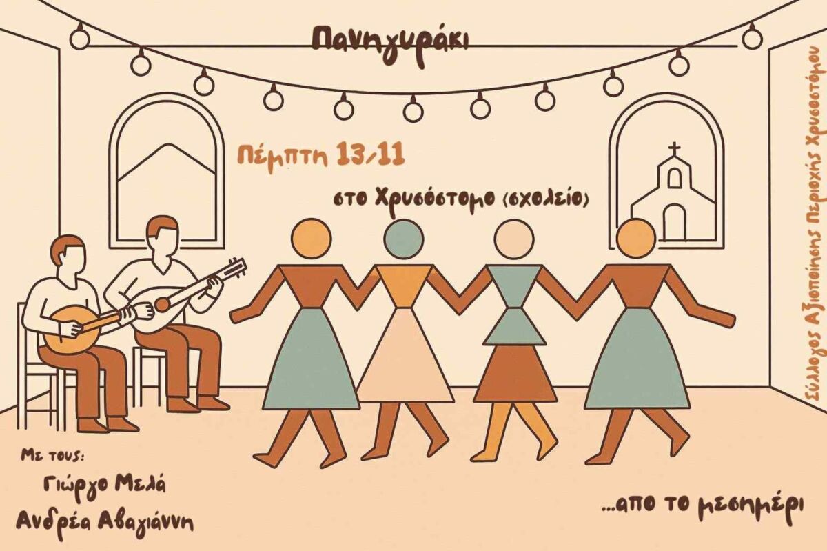 Από το μεσημέρι της Πέμπτης 13 Νοεμβρίου, ανήμερα της εορτής του Αγίου Ιωάννη του Χρυσοστόμου, ο Σύλλογος Αξιοποίησης Περιοχής Χρυσοστόμου διοργανώνει “πανηγυράκι”, με τους μουσικούς Γιώργο Μελά και Ανδρέα Αβαγιάννη, στο σχολείο του χωριού.