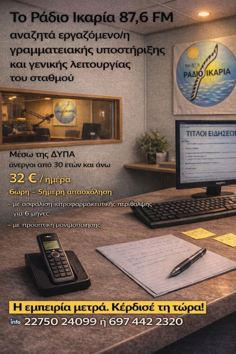 Το Ράδιο Ικαρία 87,6 FM αναζητά εργαζόμενο ή εργαζόμενη που θα ενταχθεί στην καθημερινή λειτουργία του σταθμού και θα μοιραστεί σταδιακά το σύνολο των εργασιών.
