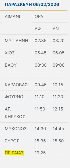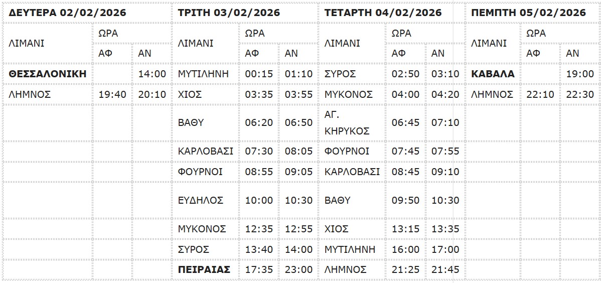 Τα δρομολόγια του πλοίου θα τροποποιηθούν, από τη Δευτέρα 2 Φεβρουαρίου έως και την Παρασκευή 6 Φεβρουαρίου 2026, σύμφωνα με τον παρακάτω πίνακα:
