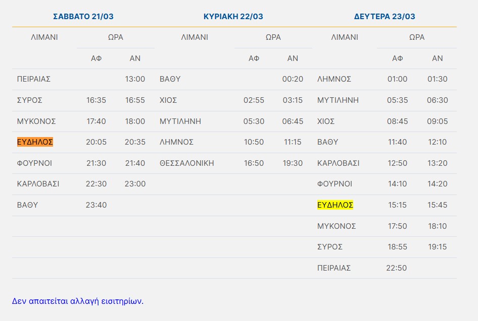 Λόγω δυσμενών καιρικών συνθηκών, το πλοίο θα προσεγγίσει τον Εύδηλο το Σάββατο 21/03 (20:05) και τη Δευτέρα 23/03 (15:15), τροποποιήσεις για τις οποίες δεν απαιτείται αλλαγή εισιτηρίων.