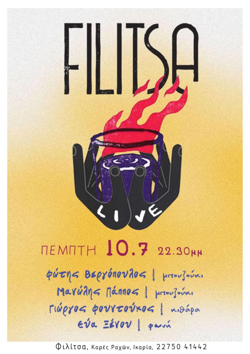 Την Πέμπτη 10 Ιουλίου, από τις 10.30 το βράδυ και μετά, το εστιατόριο Filitsa στις Καρές Ραχών σας προσκαλεί σε μια βραδιά με ζωντανή μουσική, αυθεντικές γεύσεις και καλοκαιρινή ατμόσφαιρα. Ο Φώτης Βεργόπουλος (μπουζούκι), ο Μανώλης Πάππος (μπουζούκι), ο Γιώργος Φουντούκος (κιθάρα) και η Εύα Ξένου (φωνή), θα ενώσουν τις δυνάμεις τους για να σας χαρίσουν μια μοναδική εμπειρία. Με το πλούσιο ρεπερτόριό τους, θα γεμίσουν την αυλή με αγαπημένες μελωδίες, παραδοσιακά τραγούδια και ρυθμούς που θα σας ταξιδέψουν.