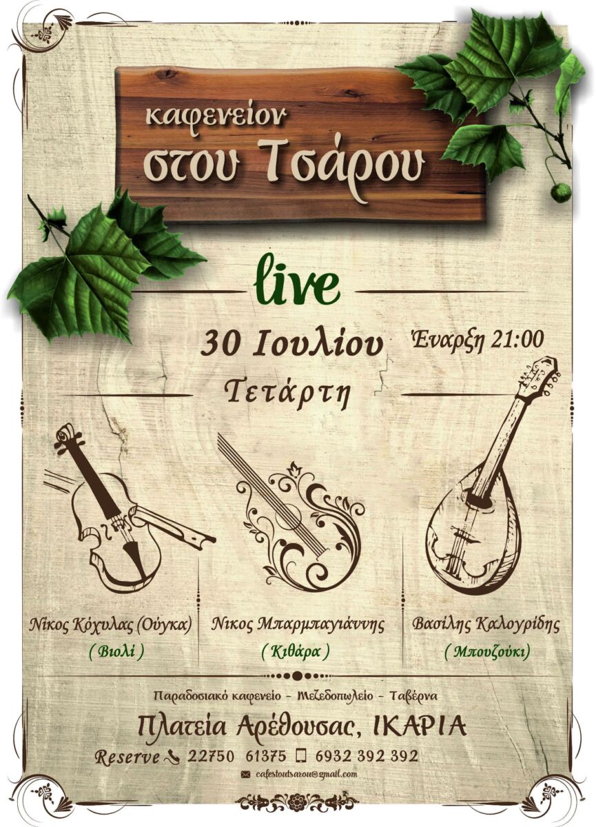 Σε ένα σκηνικό που μοσχοβολά Ικαρία και φιλοξενία, ο Νίκος Κόχυλας (Ούγκα) στο βιολί, ο Νίκος Μπαρμπαγιάννης στην κιθάρα και ο Βασίλης Καλογρίδης στο μπουζούκι, ενώνουν τις νότες και τις ψυχές τους για να χαρίσουν μια βραδιά γεμάτη παραδοσιακούς ήχους, νοσταλγία και χρώματα του νησιού.